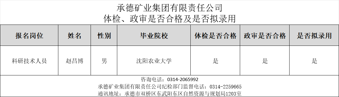 公示:承德礦業集團有限責任公司體檢、政審是否合格及是否擬錄用